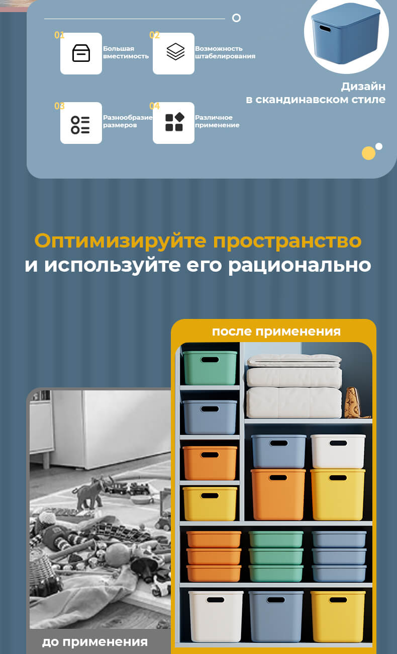 Подходит для хранения игрушек, одежды, документов и различных мелочей. Отличное решение для дома, офиса и склада.