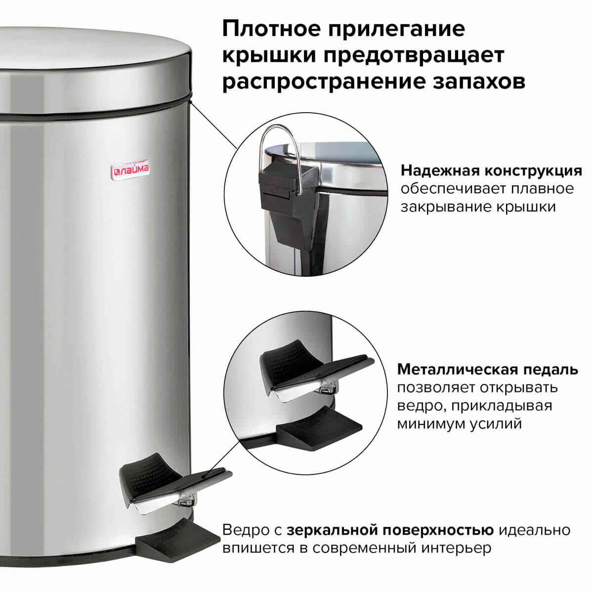 Ведро-контейнер для мусора (урна) с педалью LAIMA Classic, 5 л, зеркальное, нержавеющая сталь, со съемным внутренним ведром